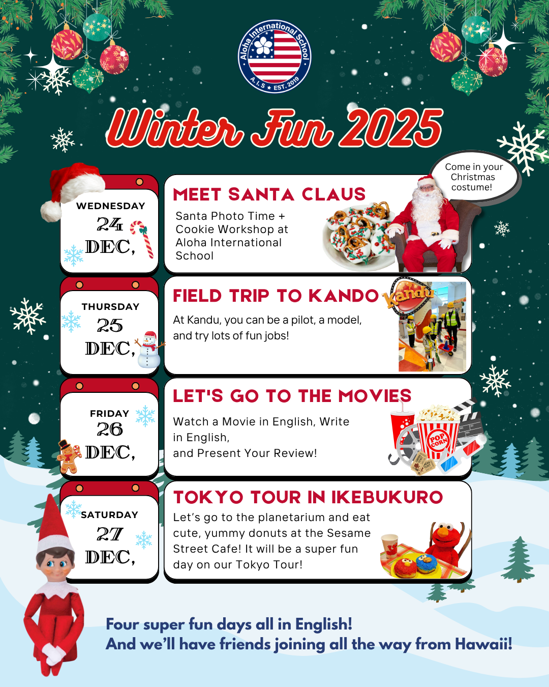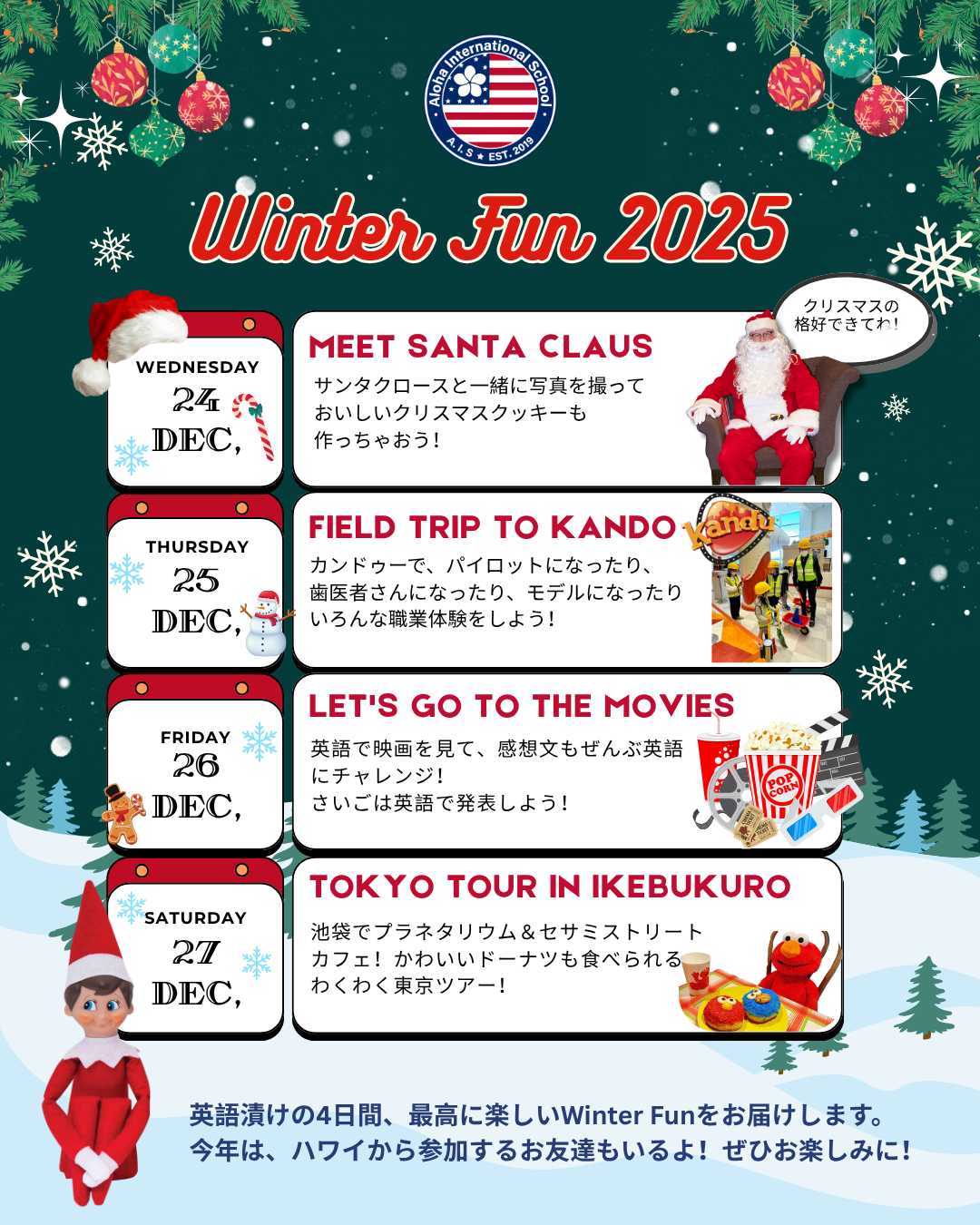 英語漬けの4日間、最高に楽しいWinter Funをお届けします。今年は、ハワイから参加するお友達もいるよ!ぜひお楽しみに!